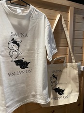 SAUNA/NO SAUNAの文字にサウニャーとワルニャーがモノクロでデザインされたTシャツです。超極厚生地&ビッグシルエットでゆったりとした今風のシルエットになっています。